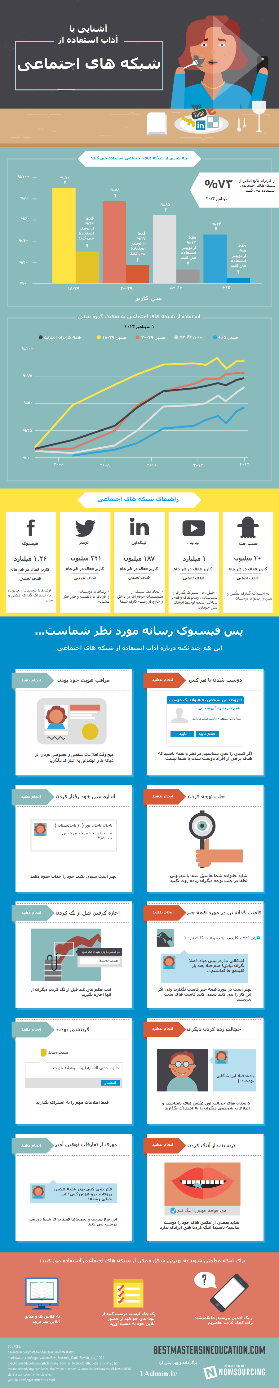 آیا به طور فعال در شبکه های اجتماعی حضور دارید؟ کدام شبکه اجتماعی را بیشتر میپسندید؟ آیا عدم رعایت آداب استفاده از شبکه های اجتماعی توسط دیگران شما را آزار میدهد؟ منتظر نظرات شما در بخش دیدگاهها هستیم. اینفوگرافیک زیر را بررسی کنید تا اطلاعات بیشتری در این مورد به دست آورید.